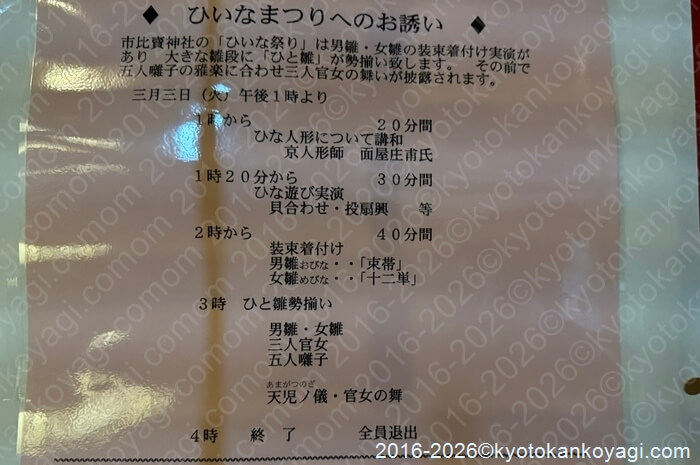 ひいなまつりとは、毎年3月3日に市比賣神社から河原町通を挟んだはす向かいにある、「ひと・まち交流館」という会場で行われるひな祭りに関するイベントです。当日は、男雛女雛の着付実演、ひと雛、官女の舞、平安貴族の遊び(投扇興、双六、貝合わせ)、お茶席の接待などが行われます。こちらに参加するには3,000円が必要です。