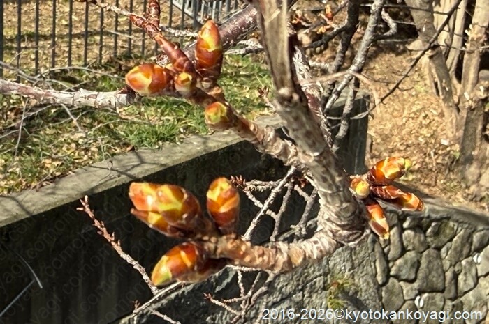 We only find buds at Toji temple, Sanjo Ohashi bridge, and Ichijo Modori Bashi bridge. Some of them reveal the color of their petals. They would bloom in next week.