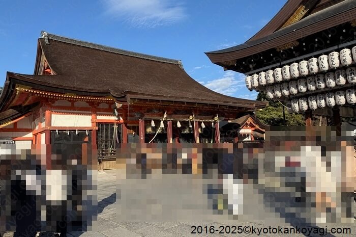 本日の八坂神社の様子ですが、空いています。国内の旅行者の皆様が増えています。概ね5割程度です。をけら火授与所が設置されています。尚、絵馬堂が工事中のため、初詣(大晦日~元日)の参拝ルートが例年と異なる可能性があります。
