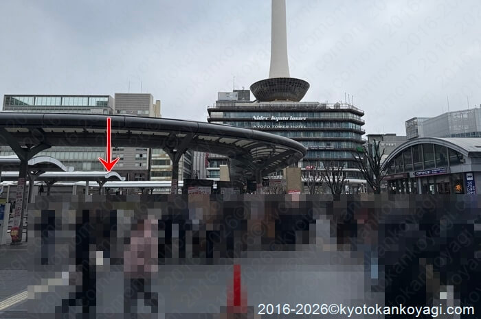 本日12時過ぎの京都駅前バス停の様子ですが、期せずして混んでます。清水寺方面行き206系統のD2乗り場の最後尾が矢印の所に来ています。