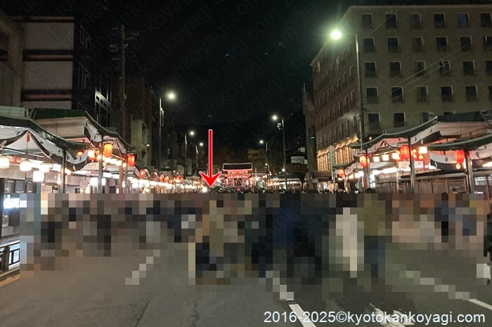 赤い円の所が西楼門(赤い宇宙人)のところで、ここから四条通りにむかって待機列ができています。