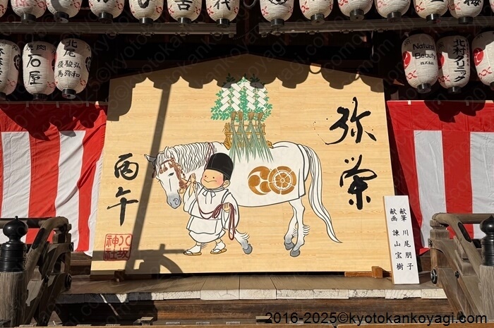 現在、舞殿(ぶでん)には来年の絵馬が奉納されています。同様の図柄の絵馬もあります。お馬さんは神籬を載せていますが、これはコロナ禍の祇園祭において、神輿が出せなかったときに御祭神を御旅所にお連れしたときの様子です。詳細は後述します。